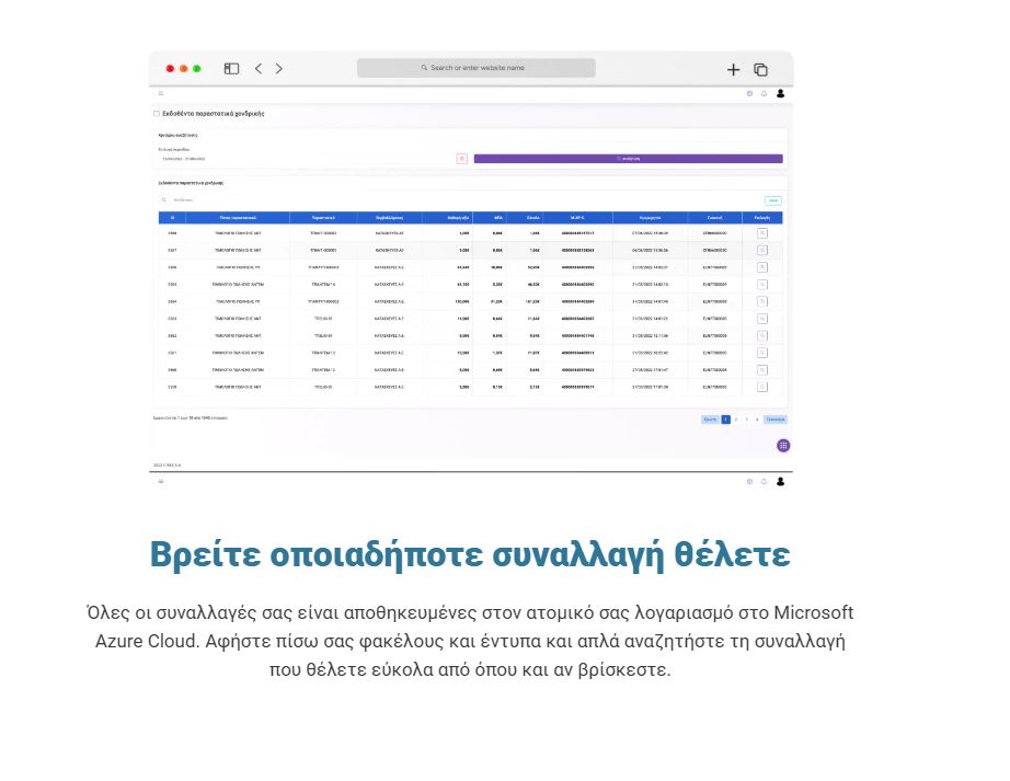- -Αρχειοθέτηση και καταχώρηση όλων των εκδοθέντων παραστατικών στον ατομικό λογαριασμό της επιχείρησης στο Microsoft Azure Cloud και διατήρησής τους για όσο χρόνο απαιτείται από την σχετική νομοθεσία.